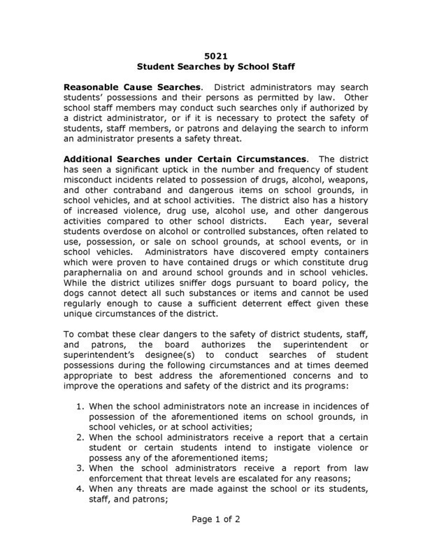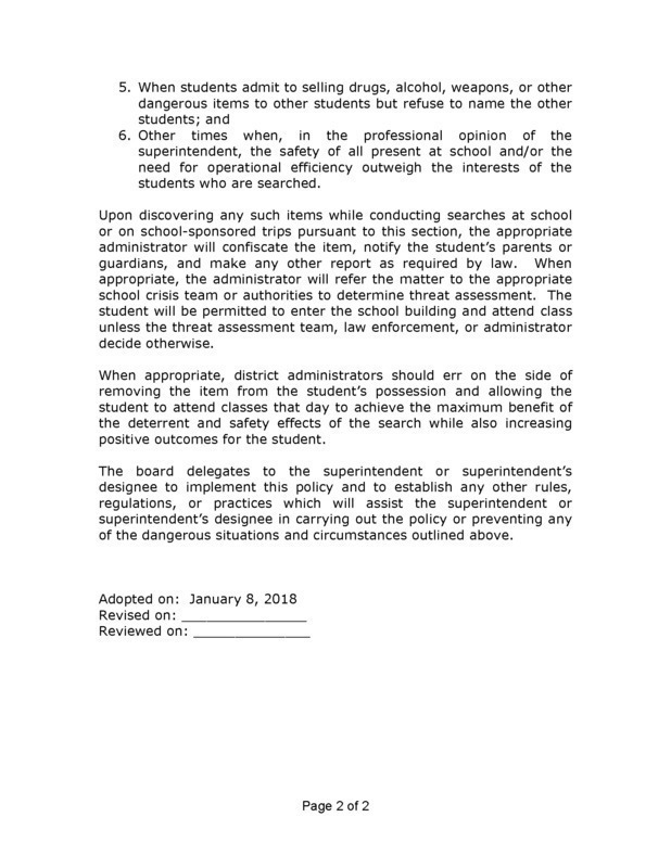Please refer to the attached policy for specific causes for search, seizure of items, and potential consequences regarding the possession of contraband. If you have any questions or concerns regarding this policy, please feel free to contact either Mrs. Hardy, Superintendent of Schools or your local Board of Education members as listed on the district website. We humbly thank you in advance for your support of this policy as we all work together to keep our community and children safe.
